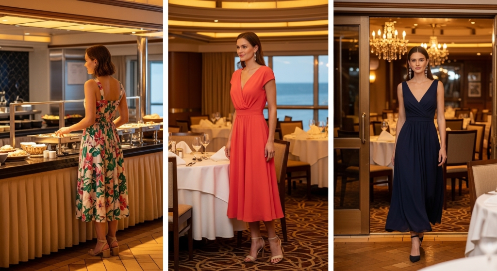 This is the outfit that causes more cruise packing anxiety than any other — and it really, truly shouldn’t. Here’s everything you need to know: one single elegant cocktail dress covers all formal nights on any mainstream cruise line.
