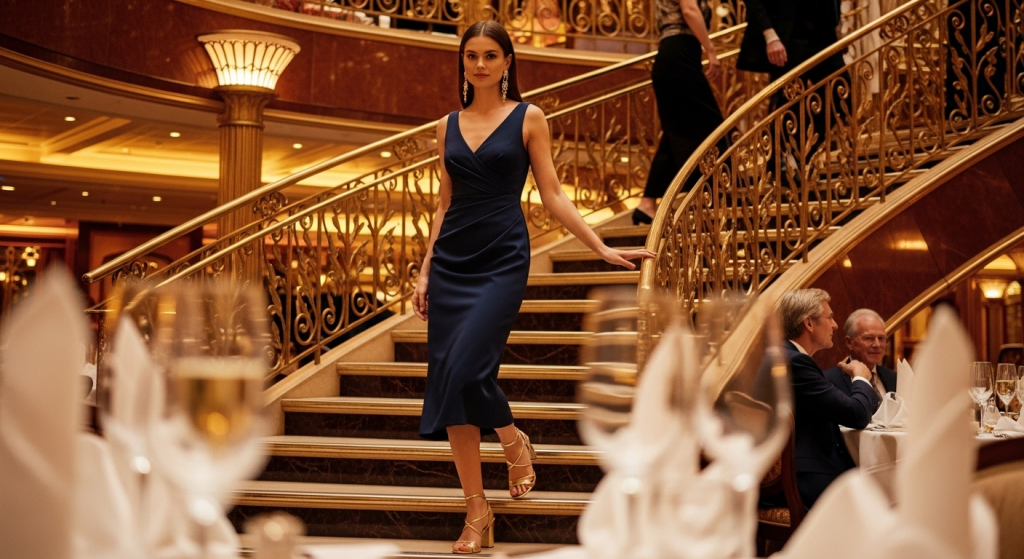 Choose an A-line, bodycon, or wrap-style cocktail dress in a genuinely timeless colour — classic black, deep navy, bold red, or anything metallic. Pair with your block-heeled or low-heeled sandals (these are far more practical for a moving ship than stilettos, which is worth mentioning). Add chandelier earrings or a statement necklace and a small evening clutch. This combination is entirely appropriate for every cruise line’s most formal occasion.