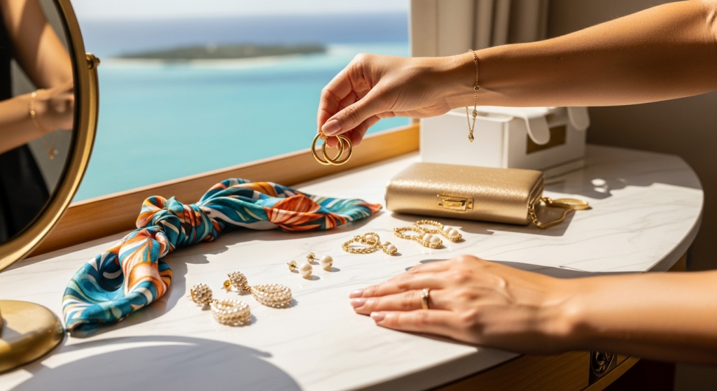 If there is one single investment that will transform your cruise capsule wardrobe from functional to genuinely stunning, it is this: a carefully curated collection of statement accessories. The same simple black wrap dress looks like an entirely different outfit depending on whether you pair it with tiny gold studs, dramatic chandelier earrings, or a chunky modern pearl necklace. This is not an exaggeration — it is how women who always look effortlessly put-together on holidays actually operate.