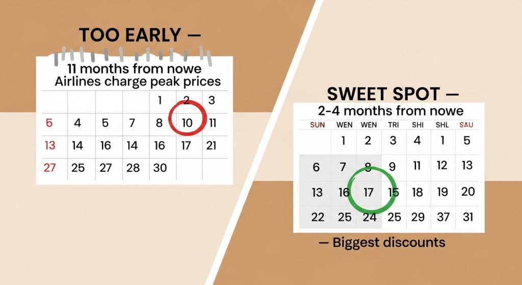 Image Prompt: Clean flat-lay graphic showing a travel calendar with two zones highlighted — a red zone at 11-12 months labeled “Highest Prices — Corporate Rate” and a green zone at 2-4 months labeled “Sweet Spot — Biggest Discounts.” Bold modern typography, neutral linen background, small airplane icon, passport and pen props. Editorial travel infographic aesthetic. 2:3 ratio.