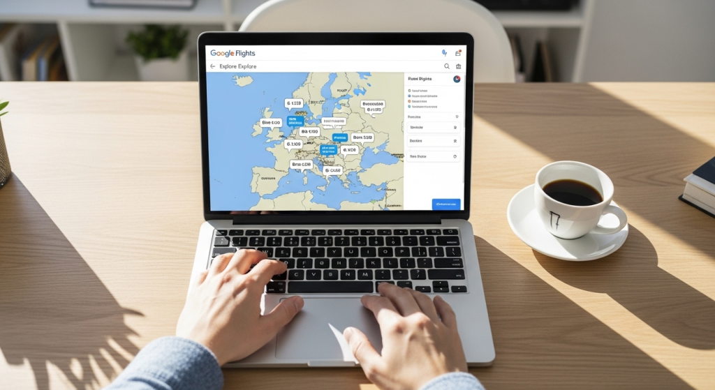 Alt Text: Laptop screen showing Google Flights explore map with European cities and business class prices highlighted, coffee cup beside laptop on bright desk