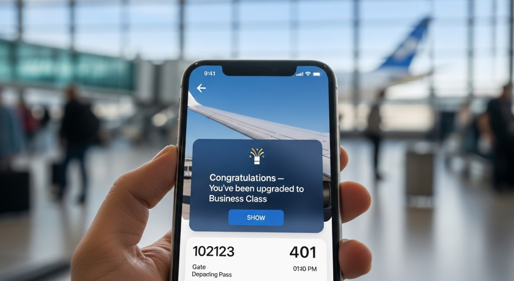 Alt Text: Smartphone screen showing airline upgrade confirmation notification for business class, boarding pass visible in background at airport gate