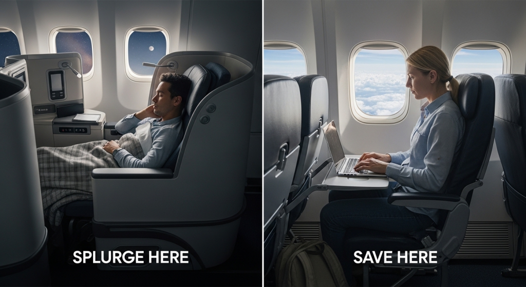 The personal rule to work from: splurge on business for any flight over 5 hours. Those are the flights where a lie-flat seat, quality meal, and actual sleep make a meaningful difference to how you feel on arrival. For short hops under a few hours, economy is perfectly fine — you’re awake, upright, and the flight is over quickly regardless.
