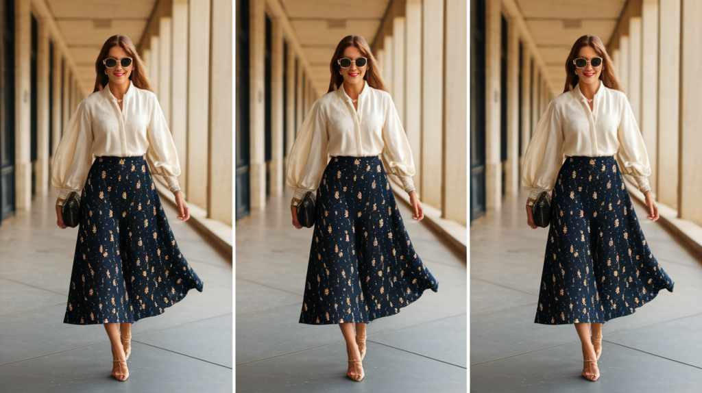 The midi skirt in silk or satin delivers instant sophistication. This length hits at the most flattering part of your leg (mid-calf) and works for both professional and social settings. Pair it with sneakers and a sweater for daytime, or heels and a silk camisole for evening. Choose neutral colors like black, navy, or camel that coordinate with your existing wardrobe.