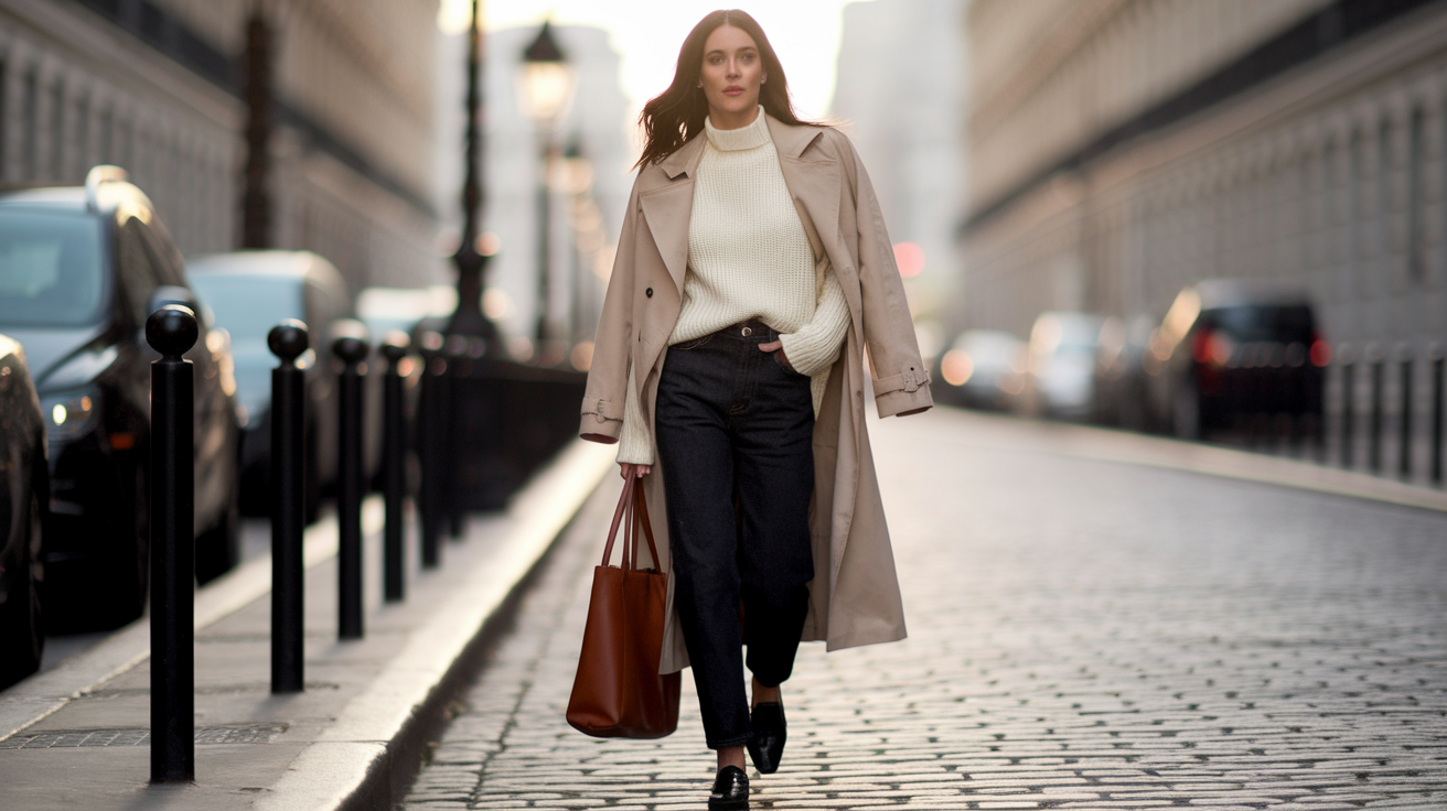 The classic trench coat in neutral tones works for every season and occasion. This timeless piece adds instant sophistication to any outfit underneath. Look for one in beige, black, or navy with classic details like a belt, epaulettes, and button cuffs. A quality trench lasts decades and never goes out of style—making it worth the investment.